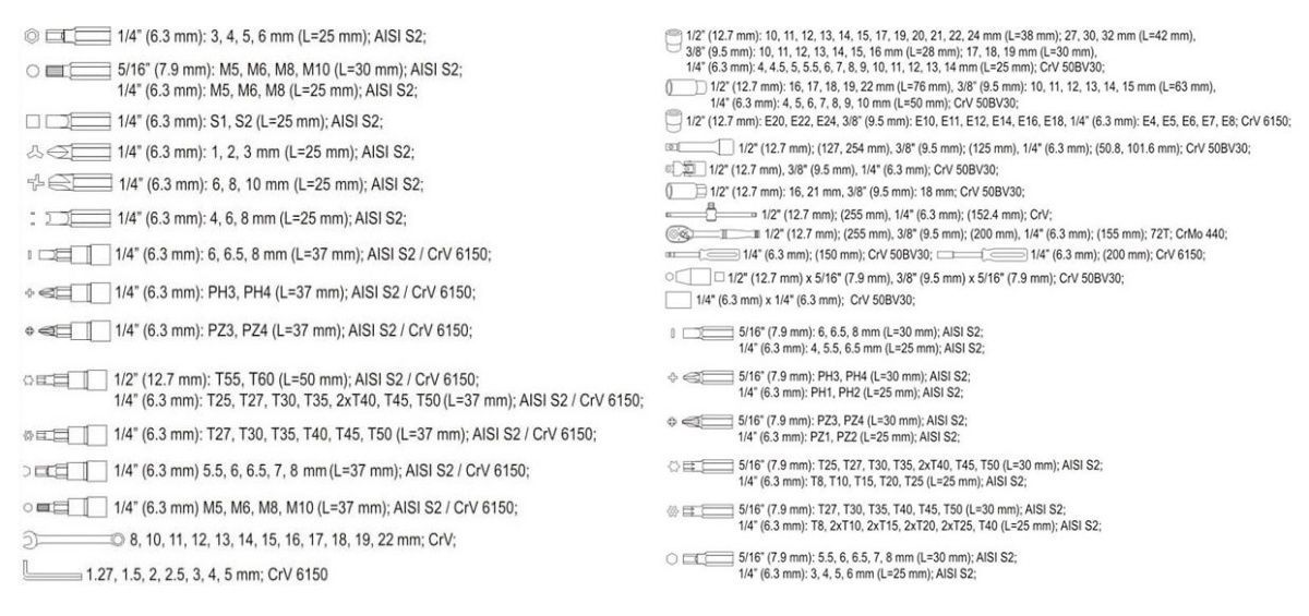 - Удлинители: 1/2": 127мм, 254мм; 3/8": 125мм; 1/4": 50мм, 100мм