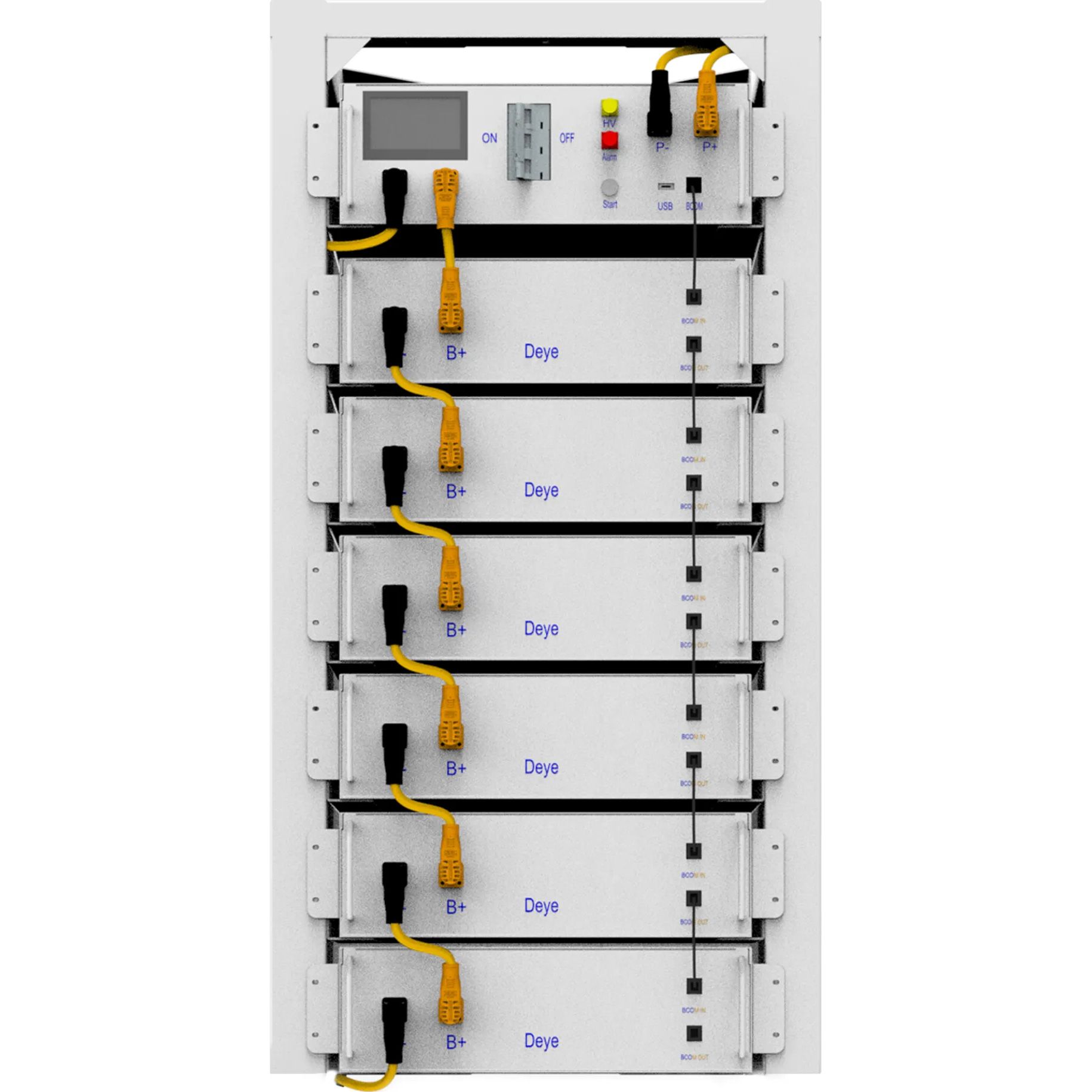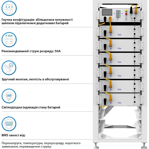 | Комплектація | Силовий кабель для послідовного підключення 6шт • модуль керування • акумуляторна батарея 6шт • комунікаційний кабель для послідовного підключення 6шт • стійка до 8 батарей • документація |