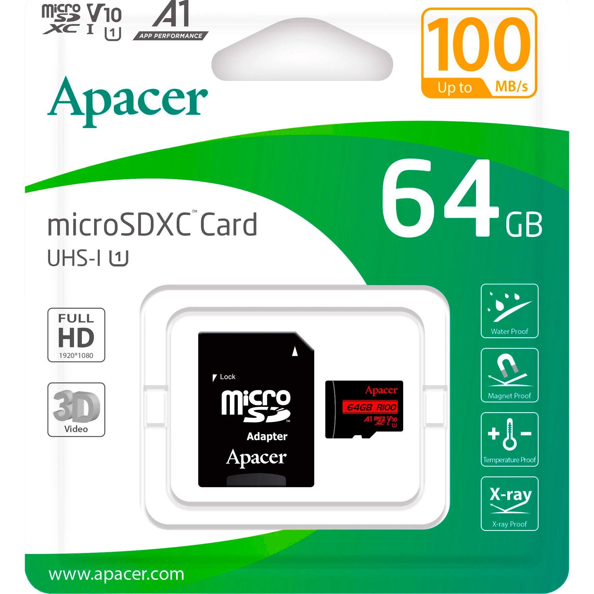 Карта пам'яті Apacer MicroSDXC R100 64GB Class 10 UHS-I/U1 + SD adapter (AP64GMCSX10UB-R)