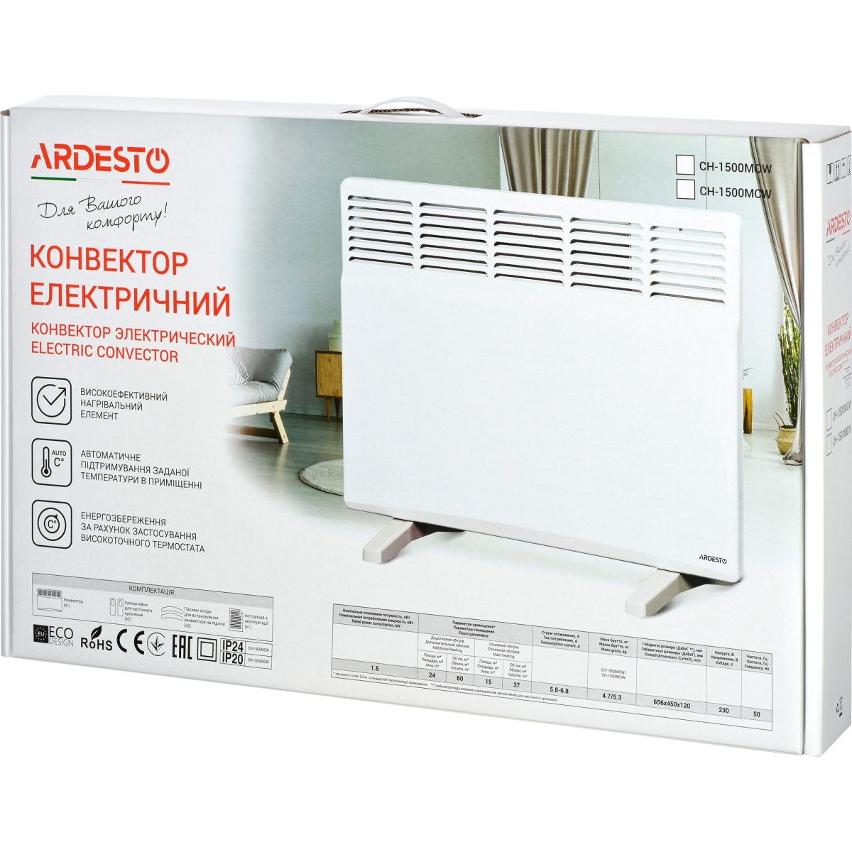 | Комплектація | Конвекційний обігрівач • опори для встановлення на підлогу • комплект кріплень для встановлення на стіну • документація |