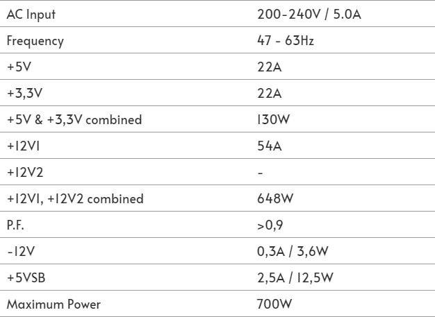 | Системи захисту | Захист від пониження напруги в мережі (UVP), Захист від короткого замикання (SCP), Захист від подачі підвищеної напруги (OVP), Автоматичний контроль швидкості вентилятора (AFC), Захист від перевантаження за сумарною потужністю по всім каналам (OPP), Захист від сплесків і стрибків напруги (SIP) |