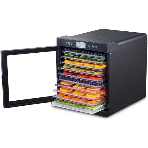 Спеціальна конструкція сушарки забезпечує рівномірний розподіл теплого повітря на всіх лотках, що дає змогу одночасно підсушувати продукти на різних рівнях без необхідності їх перестановки. Видалення вологи забезпечується за допомогою безперервної циркуляції теплого повітря, що дає змогу зберігати корисні властивості продуктів.