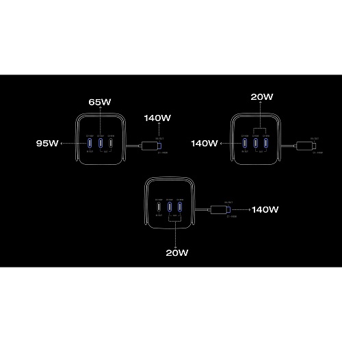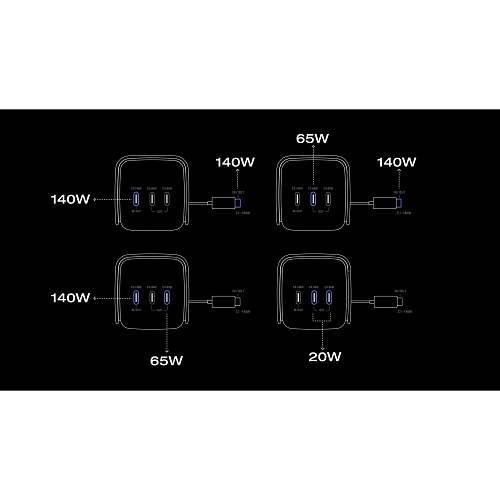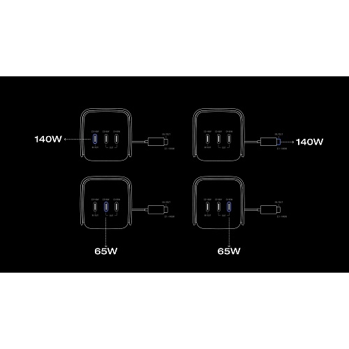 | Вихідні порти | USB-C: 5V (3A) • 140W USB-C: 5V (3A) • 140W USB-C: 5V (3A) • 65W USB-C: 5V (3A) • 65W |
