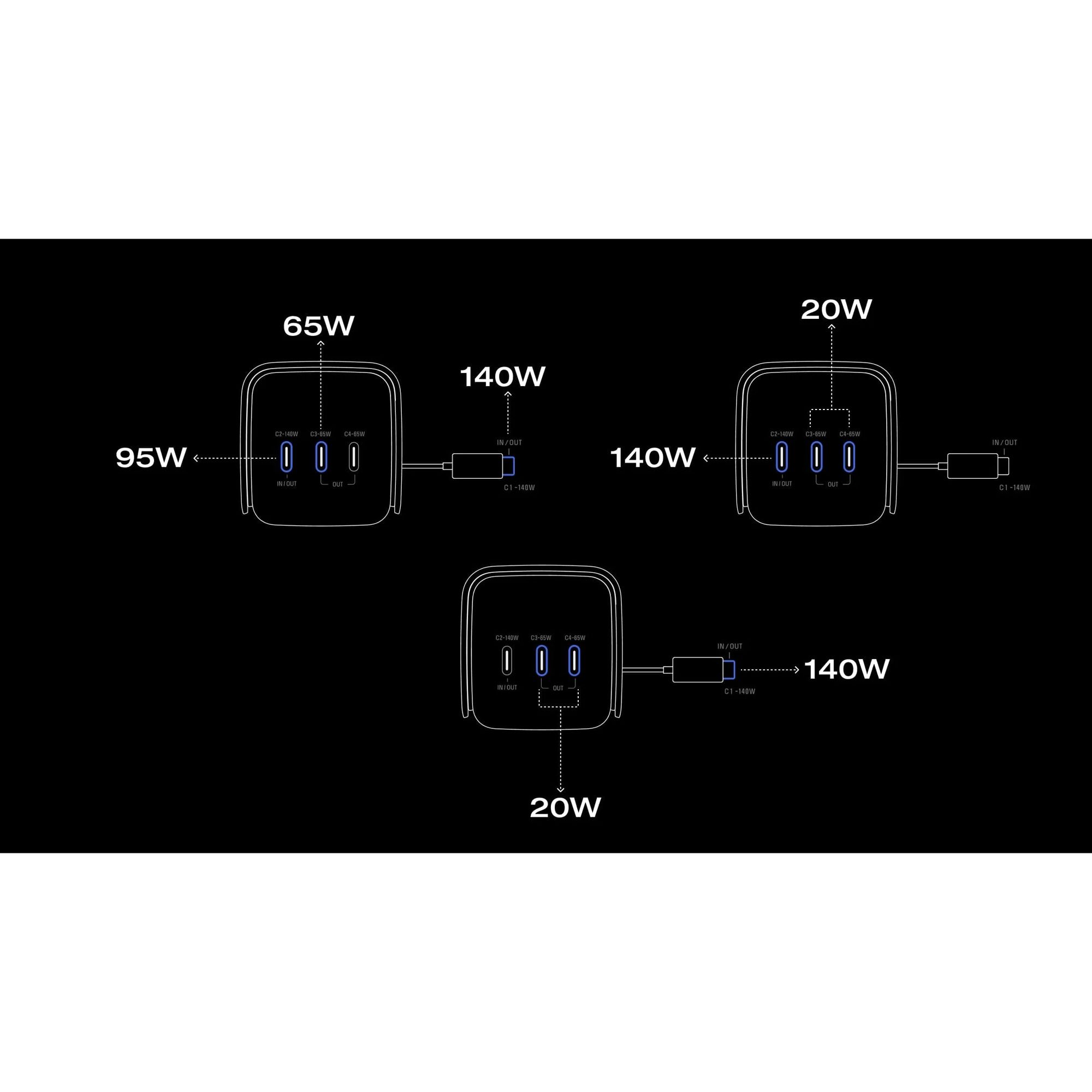 | Вихідні порти | USB-C: 5V (3A) • 140W USB-C: 5V (3A) • 140W USB-C: 5V (3A) • 65W USB-C: 5V (3A) • 65W |