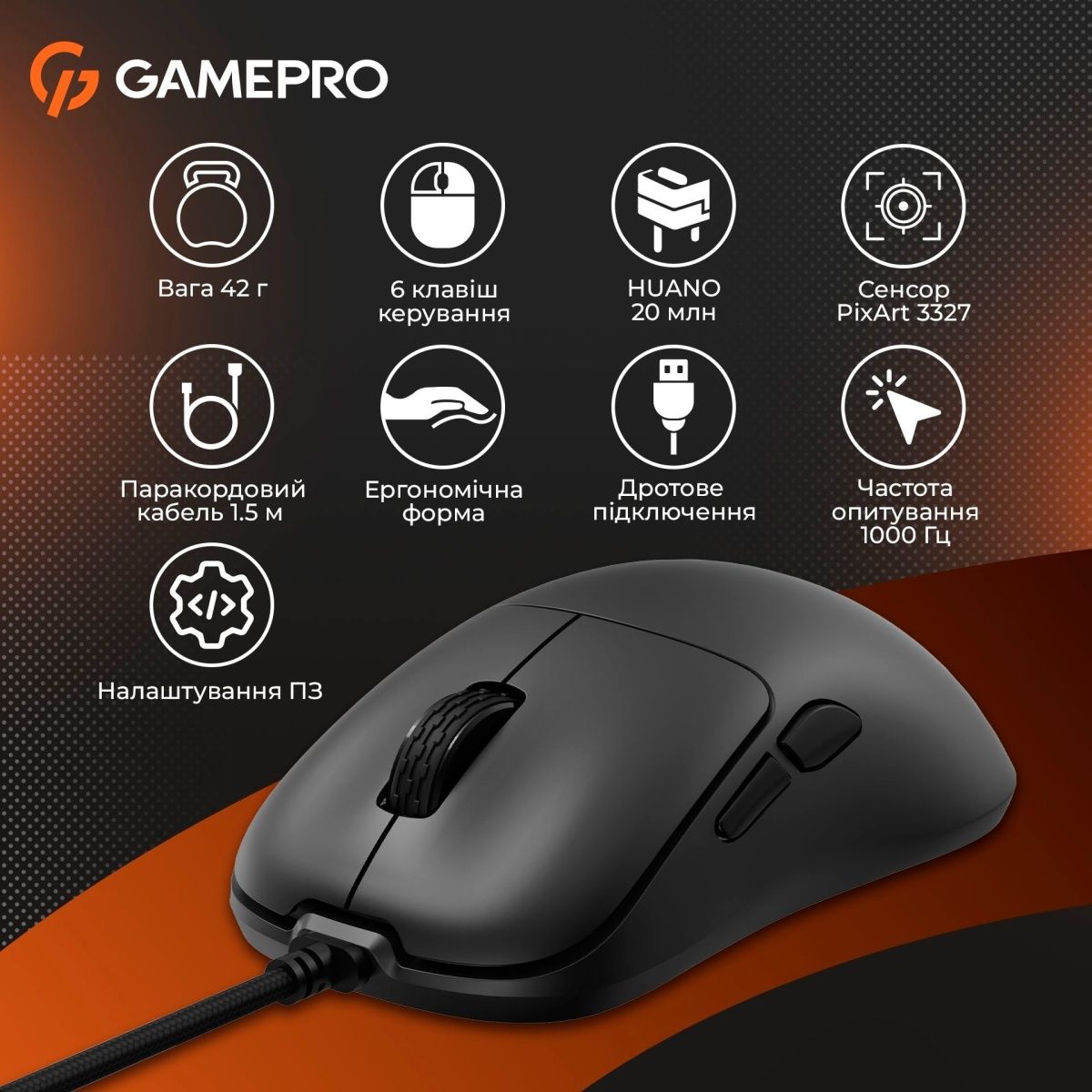 GamePro GM690 — це ультралегка ігрова миша, вагою всього 42 грами, яка створена для зручності в управлінні та високої продуктивності. Вона оснащена оптичним сенсором PixArt 3327 з регульованою роздільною здатністю до 10 000 DPI, що забезпечує точність і чуйність при будь-якій швидкості руху. А частота опитування в 1000 Гц, шість кнопок, довгий термін служби перемикачів і універсальна сумісність роблять цю мишу ідеальною для геймерів, які прагнуть до перемог.