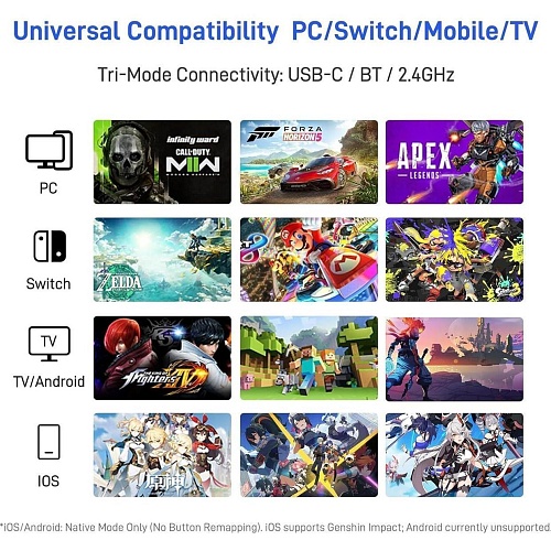 Контролер Flydigi Apex 5 підтримує як проводове, так і бездротове підключення, надаючи вам свободу вибору, як ви хочете грати. Провідне підключення гарантує стабільний і беззаперечний досвід, тоді як бездротовий варіант забезпечує чистоту та відсутність зайвих проводів. Що стосується сумісності, Apex 5 без проблем працює з основними ігровими платформами, такими як ПК, Nintendo Switch/Switch 2, Android та iOS. Це робить його відмінним вибором для геймерів, які хочуть мати один контролер для різних систем.