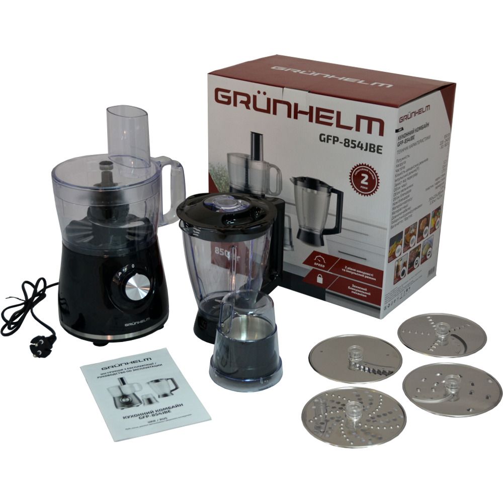 Завдяки надзвичайно потужному мотору можна легко втілити в життя всі свої кулінарні ідеї. Завдяки відносно невеликим розмірам і масі, при купівлі кухонної машини Grunhelm GFP-854JBE, ви отримуєте відразу безліч переваг. За функціональністю цей комплекс істотно перевершує традиційні міксери або блендери. А потужний 850 Ватт мотор з регулюванням швидкостей і набір змінних насадок різного призначення також цілком дають змогу даному універсальному приладу успішно конкурувати навіть з деякими більш дорогими кухонними машинами!
