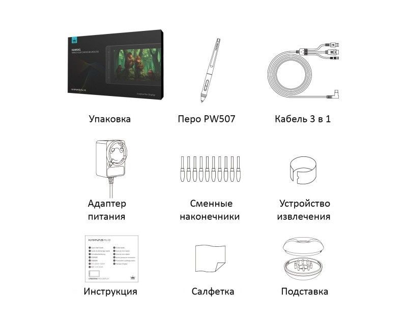 Комплектація | Графічний планшет Kamvas Pro 16, Перо без батареї PW507, Кабель 3-в-1, Блок живлення, Штекери для розетки, Тримач пера PH05, Змінні наконечники для пера x 10, Кліпса для наконечників пера, Серветка для чищення, Інструкція |