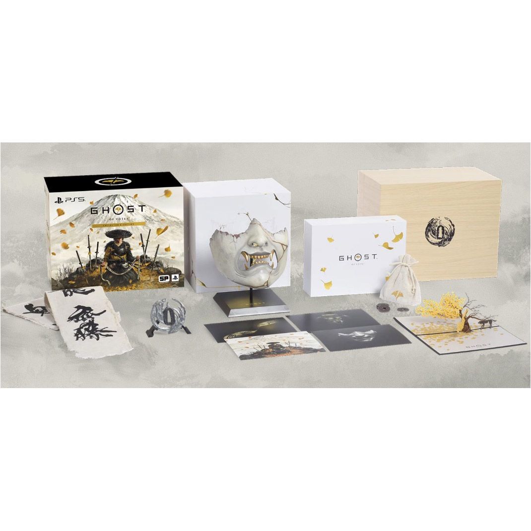 | Комплектація | Ваучер на гру Ghost of Yotei • маска привида • пояс • цуба • паперове дерево гінко • картки з ілюстраціями • монетна гра дзеніхадзікі • мішечок до дзеніхадзікі |