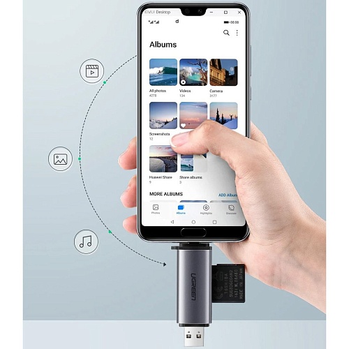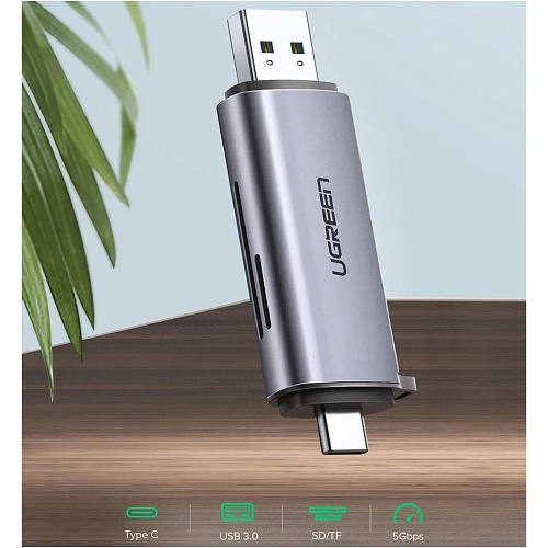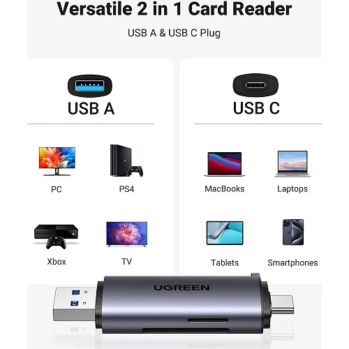 Кардрідер Ugreen CM185 оснащений подвійним інтерфейсом USB-A і USB-C, що забезпечує сумісність із сучасними пристроями — від ноутбуків і персональних комп'ютерів до смартфонів та планшетів. Інтегрована конструкція 2-в-1 дозволяє легко підключати карти пам’яті до техніки з різними роз’ємами без потреби у додаткових адаптерах. Пристрій підтримує роботу як із портами USB-C, так і зі стандартними USB 3.0, що робить його універсальним рішенням для швидкої передачі даних у будь-якому середовищі.