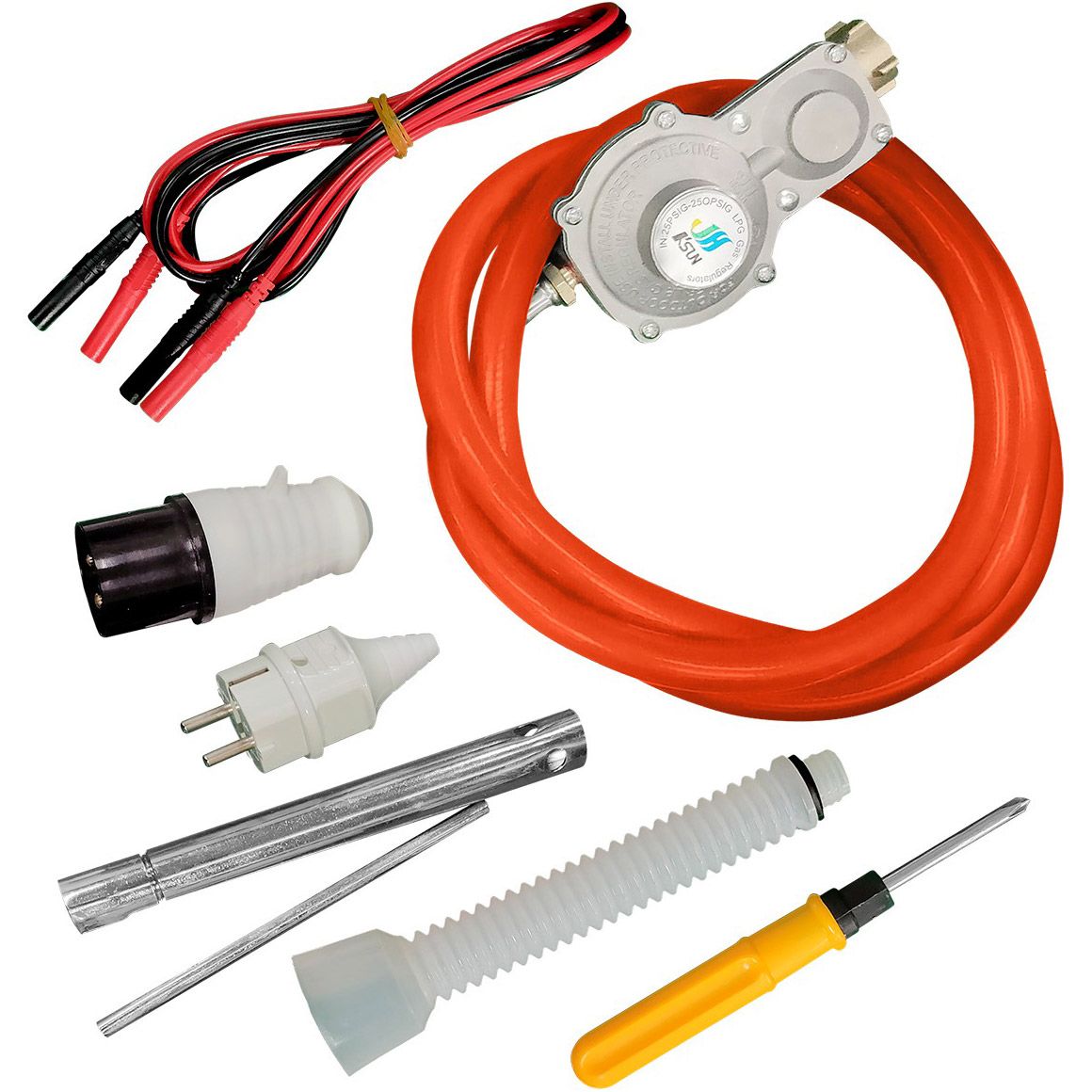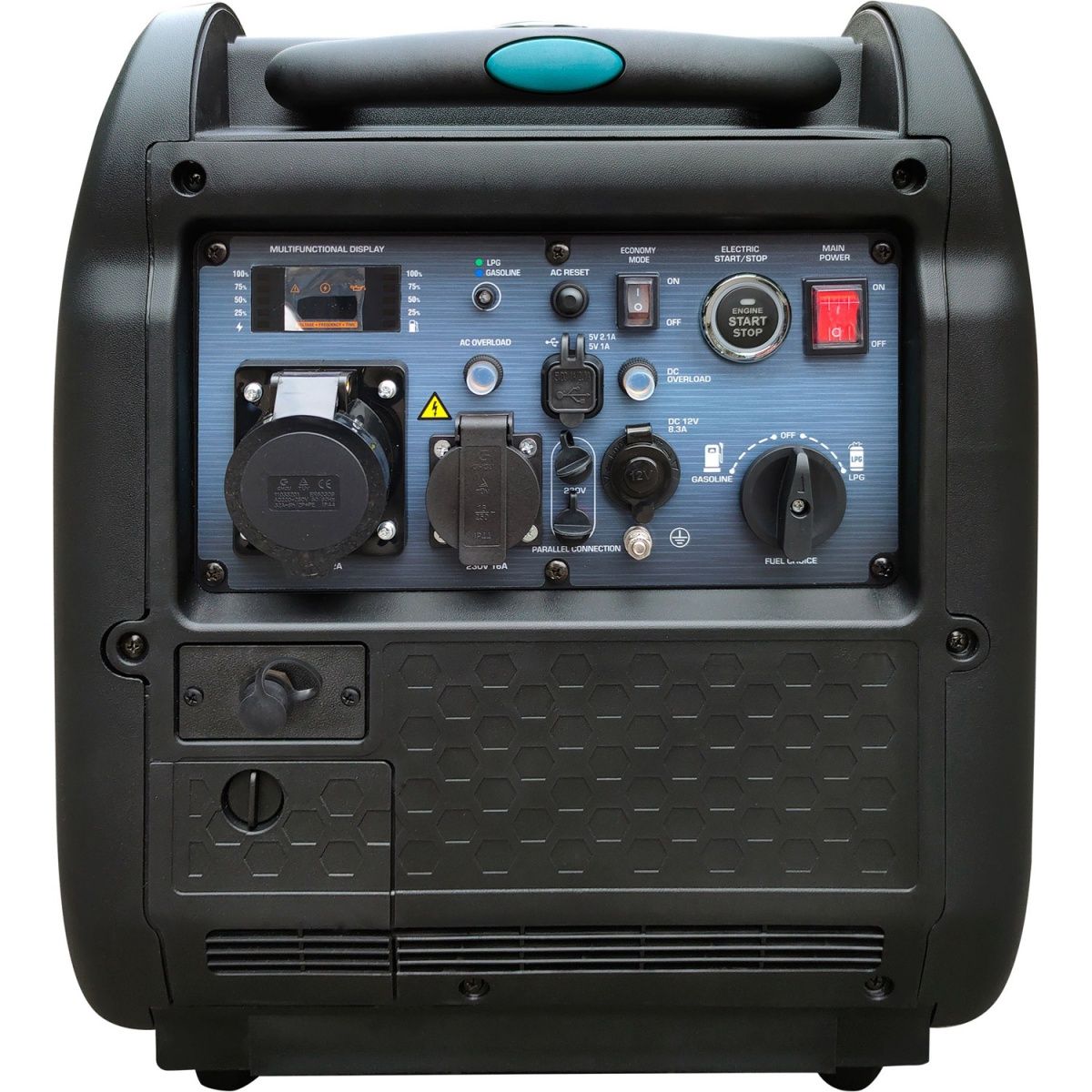 | Комплектація | Генератор • ключ для свічок запалювання • заправна лійка • кабель для паралельного під'єднання • газовий шланг із редуктором тиску • вилка на 16А • хрестова викрутка • «крокодили» для заряджання акумуляторів • документація |