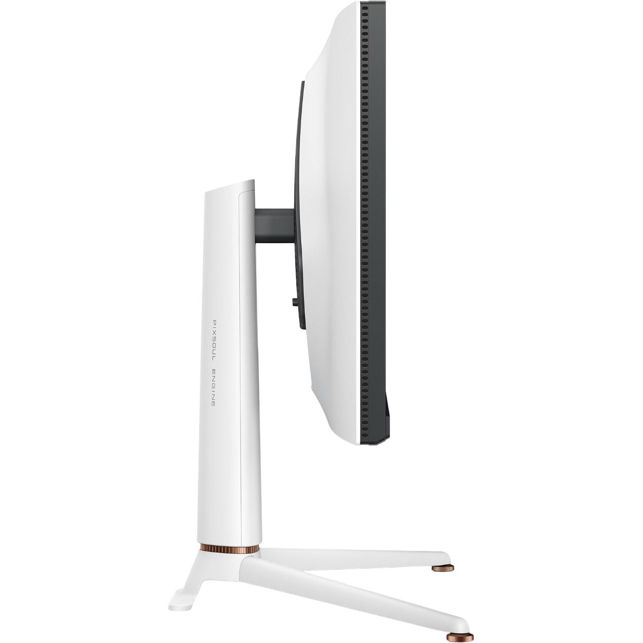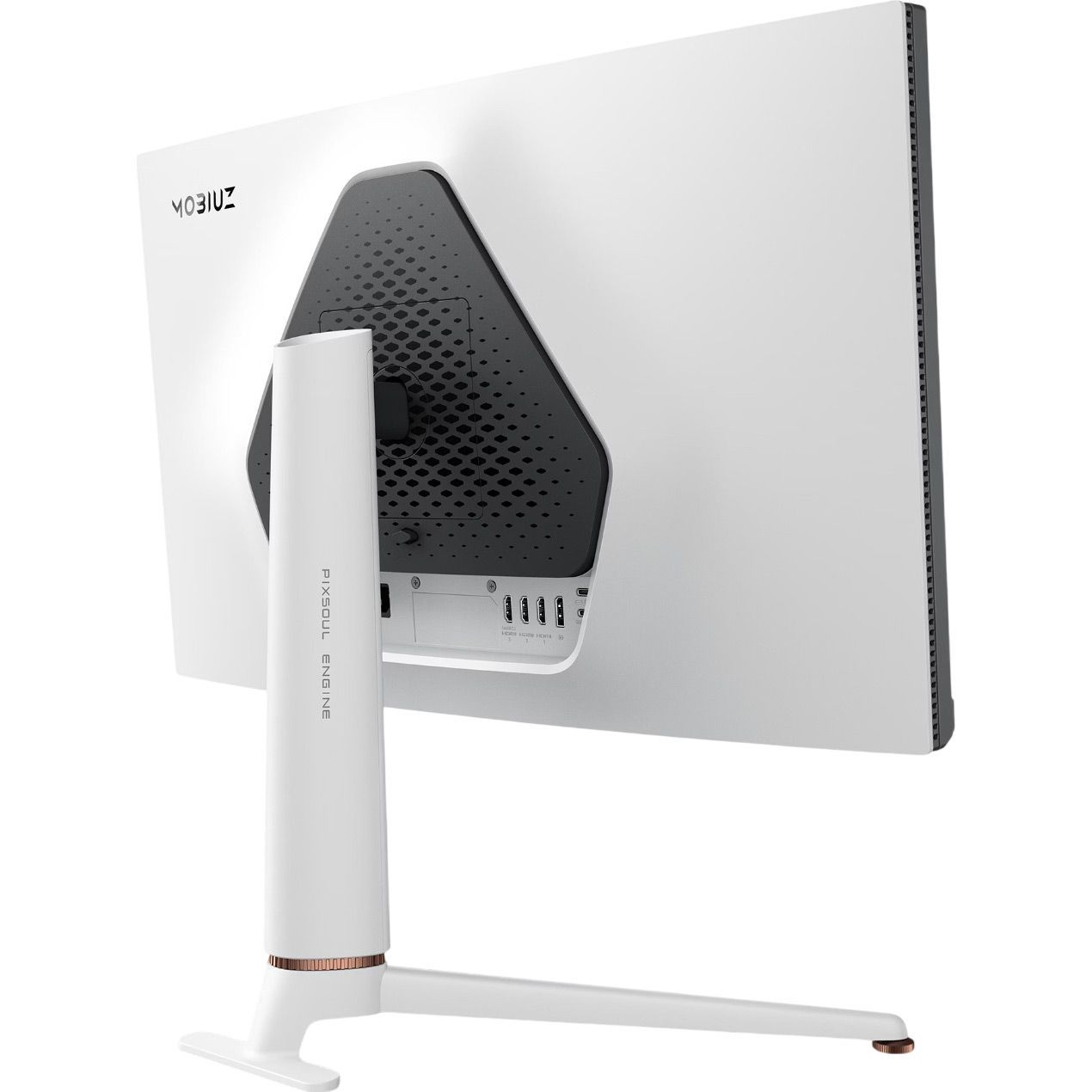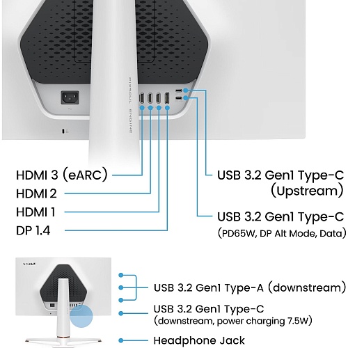 Елегантний білий корпус з мінімалістичними рамками гармонійно виглядає в сучасному інтер'єрі. Монітор обладнано портами DisplayPort 1.4, двома HDMI 2.1, USB-хабом та аудіовиходом для навушників, що дозволяє легко підключати комп'ютери, консолі та інші пристрої. Легко перемикайтеся між різними пристроями, користуючись вбудованим перемикачем KVM. Екологічність також на висоті – корпус виготовлений на 85% з переробленого пластику (PCR), а упаковка повністю придатна для переробки.