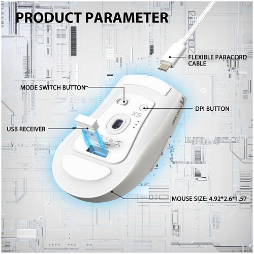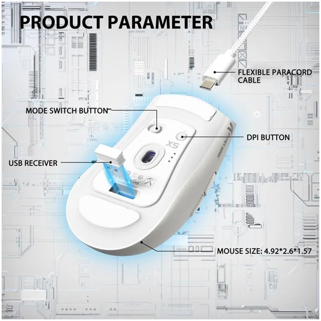 Attack Shark X5 оснащена вбудованим акумулятором, який забезпечує тривалу автономну роботу без частого підключення до зарядки. Завдяки енергоефективній конструкції пристрій може працювати багато годин без підзарядки, що робить його зручним для активного використання протягом дня. Миша підтримує швидке заряджання через сучасний роз’єм USB-C, що дозволяє швидко відновити заряд і продовжити роботу. Окремою особливістю моделі є стильне RGB-підсвічування, яке додає яскравості робочому місцю або ігровому простору. Поєднання сучасного дизайну, легкої конструкції та функціональності робить Attack Shark X5 практичним і універсальним аксесуаром для тих, хто цінує комфорт, продуктивність та стильний вигляд техніки.