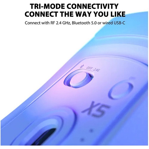 Attack Shark X5 підтримує одразу декілька варіантів підключення, що робить її універсальним рішенням для різних пристроїв. Мишу можна використовувати через бездротовий адаптер 2.4 ГГц, підключати через Bluetooth або працювати у дротовому режимі за допомогою кабелю USB. Така універсальність дозволяє легко перемикатися між комп’ютером, ноутбуком чи іншими пристроями без необхідності постійно підключати нове обладнання. Бездротовий режим забезпечує свободу рухів і відсутність зайвих кабелів на столі, а провідний режим стане корисним під час заряджання або коли потрібна максимально стабільна робота. Радіус бездротового підключення дозволяє комфортно користуватися мишею на відстані до 10 метрів від пристрою, що забезпечує зручність у різних умовах використання.