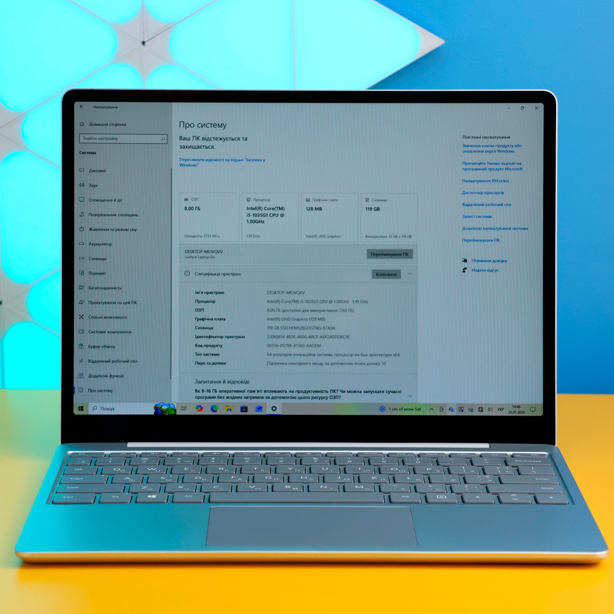Конфігурація з 8 ГБ оперативної пам’яті та твердотільним накопичувачем SSD на 128 ГБ забезпечує швидкий запуск системи та програм, а також плавну роботу в багатозадачному режимі. Перемикання між застосунками відбувається без відчутних затримок, що важливо для навчання, роботи з документами та повсякденного використання. SSD-накопичувач робить систему тихою та швидкою, а також позитивно впливає на загальне відчуття комфорту під час роботи з ноутбуком.