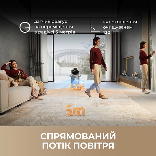 Технологія Enviro Detect допомагає відстежувати ваші переміщення в режимі реального часу та автоматично регулювати подачу повітря з урахуванням вашого розташування. Завдяки цій технології очищувач ефективно створює цілеспрямований потік чистого повітря у радіусі 5 м.
