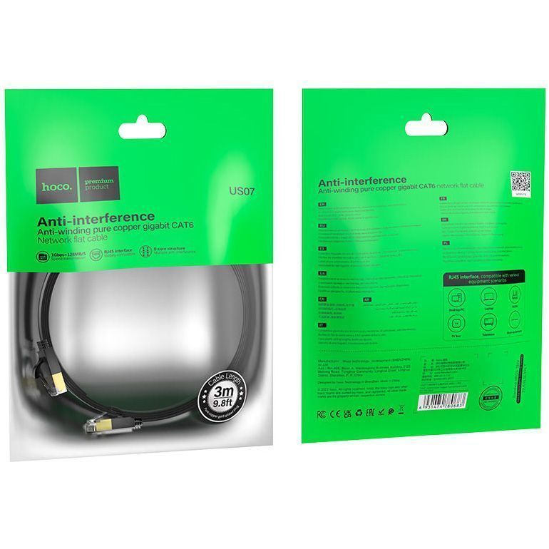 Патч-корд Hoco US07 General Cat 6 U/UTP Pure Copper Flat Network Cable 3m Black (780690)