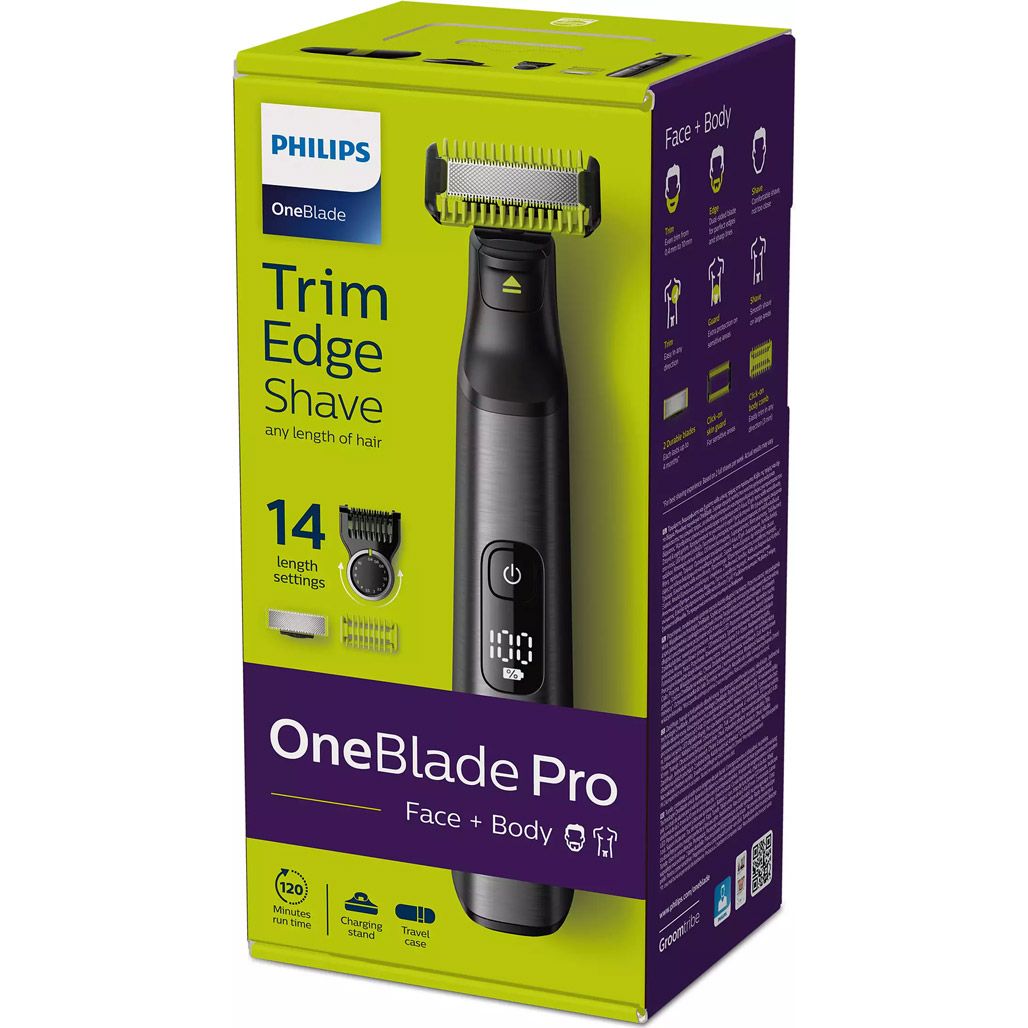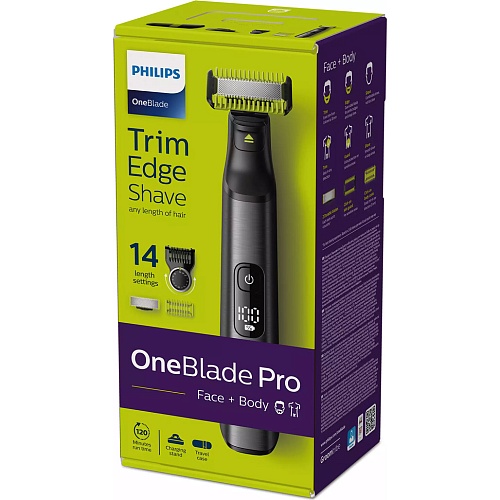 OneBlade Pro має швидкий ріжучий блок, який здійснює 12 000 рухів за хвилину, забезпечуючи ефективне зрізання навіть довгого волосся. Ковзне покриття і закруглені кінці лез захищають вашу шкіру від порізів і подразнень, роблячи гоління ще комфортнішим. Плаваюче лезо тримера 360 повторює контури вашої особи, забезпечуючи ще більш ефективне та комфортне гоління на будь-яких ділянках.