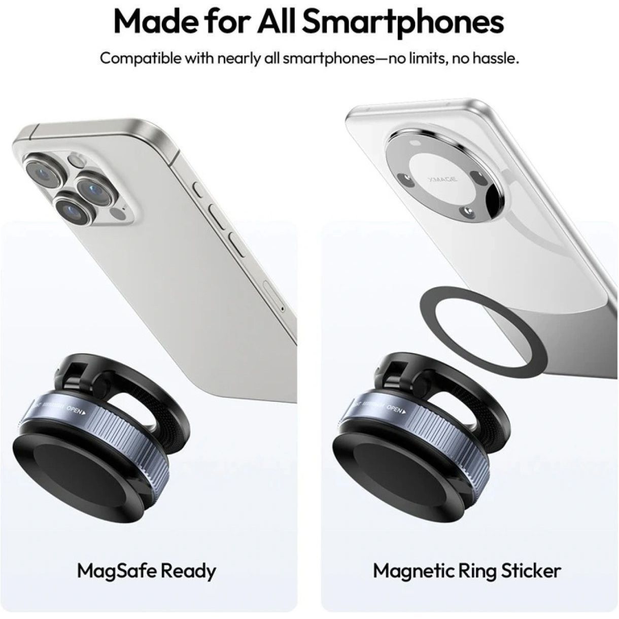 | Комплектація | Присоска для телефону магнітна • магнітний кільцевий стікер • клейка підкладка • набір серветок для очищення • документація |
