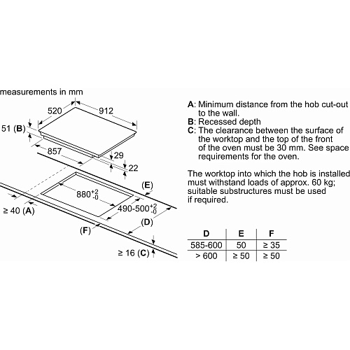 Розміри | 912 х 520 мм (варильна поверхня) • 880 х 490-500 х 51 мм (монтажні розміри) |