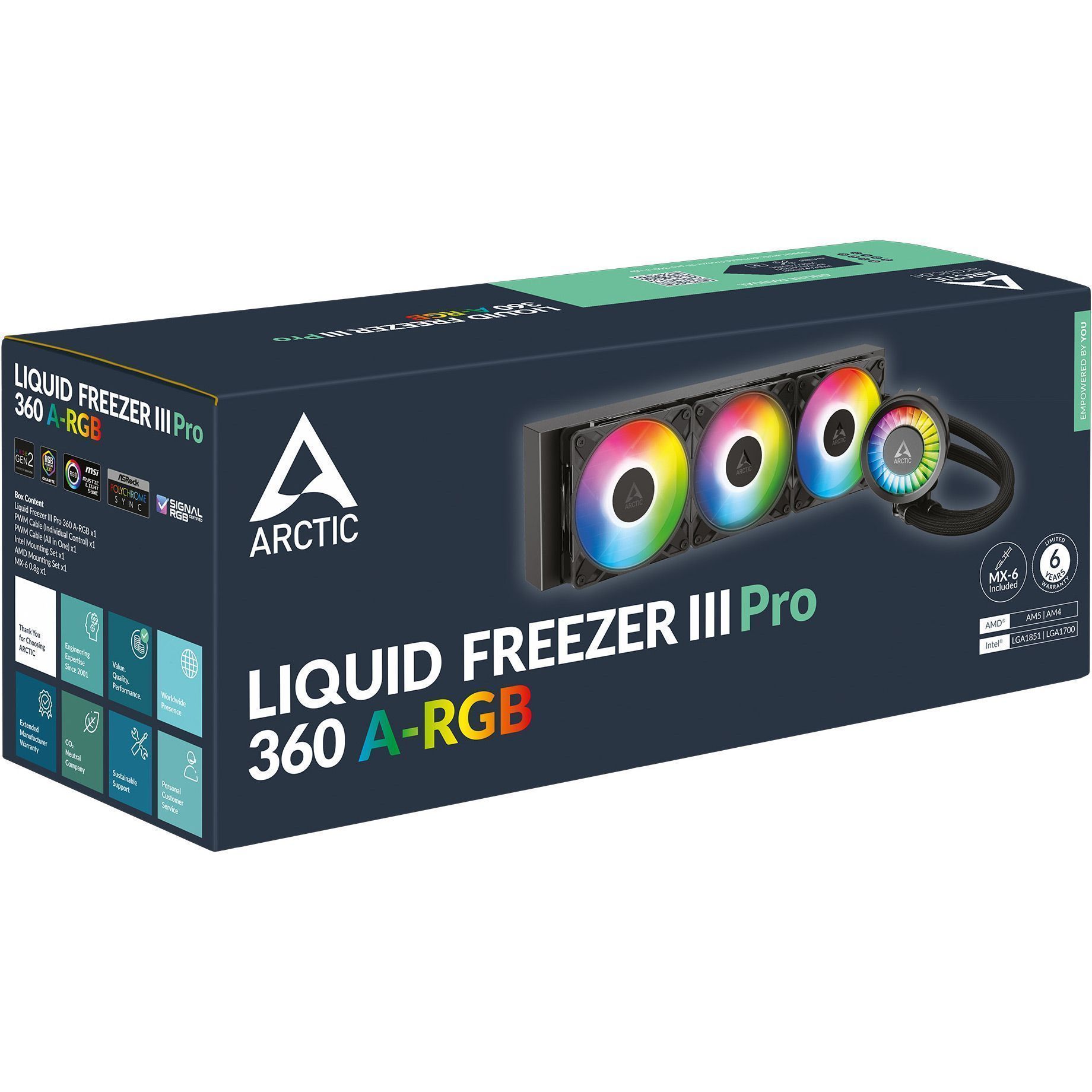 Arctic Liquid Freezer III Pro 360 A-RGB оснащена спеціальним вентилятором A-RGB VRM із PWM-керуванням, який знижує температуру регулятора напруги та підтримує стабільну роботу системи навіть під високим навантаженням. Такий підхід дозволяє ефективніше розподіляти тепловідведення і запобігає перегріванню ключових елементів живлення. Завдяки зміщеному кріпленню для процесорів Intel та AMD холодна пластина розташовується безпосередньо над гарячою точкою кристалу, що забезпечує швидшу і точнішу передачу тепла. Доповнює рішення контактна рамка Intel, яка оптимізує розподіл тиску та сприяє довшому терміну служби процесора разом із покращеним відведенням тепла. Модель вирізняється динамічною підсвіткою вентиляторів, що додає системі індивідуальності та візуальної привабливості.