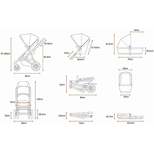 Розміри | Коляска з прогулянковим блоком: 1090 х 850 х 823 мм • прогулянковий блок: 630 х 205 мм • люлька: 760 х 675 х 265 мм • внутрішні розміри люльки: 400 х 340 мм • складена рама з прогулянковим блоком: 830 х 420 мм |
