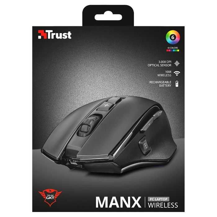 Trust GXT 140 Manx rechargeable wireless (21790) - бездротова ігрова миша з вбудованим акумулятором, яка поєднує в собі досягнення сучасних комп'ютерних технологій і розробок в області дизайну. Ергономічна форма маніпулятора забезпечує комфортну роботу. Стильний дизайн і колір роблять мишку не тільки надійним периферійним пристроєм введення, але і чудовим аксесуаром. Ви оціните сприйнятливе і плавне управління покажчиком миші, який досягається за рахунок використання технології відстеження з високою роздільною здатністю — 3000 DPI.