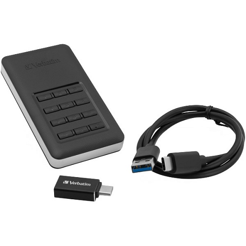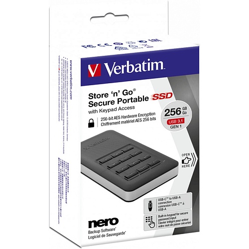 Зовнішній SSD накопичувач Verbatim Store 'n' Go Portable оснащений технологією апаратного шифрування AES з ключем 256 біт, що забезпечує безперервне шифрування всіх даних на диску в режимі реального часу. Вбудована клавіатура дає змогу вводити пароль безпосередньо на пристрої, що виключає можливість збереження паролів на комп'ютері або в постійній пам'яті системи. Це значно підвищує рівень безпеки порівняно з програмним шифруванням. Якщо пристрій потрапить у чужі руки, жорсткий диск заблокується після 20 невдалих спроб уведення пароля і потребуватиме повторного форматування.