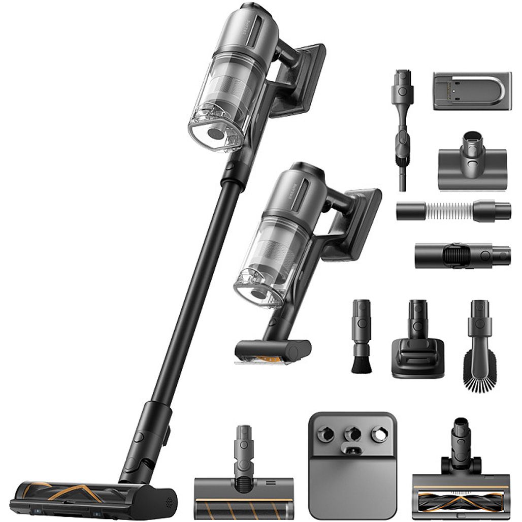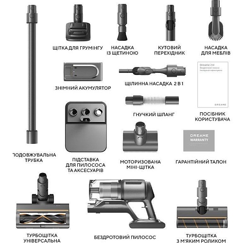 | Комплектація | Вертикальний пилосос • знімний акумулятор • підлоговий стенд з док-станцією • щілинна насадка комбінована 2 в 1 • щітка для грумінгу • насадка для меблів • центральна трубка • гнучкий шланг • турбощітка універсальна • турбощітка з м'яким роликом • міні-турбощітка • |