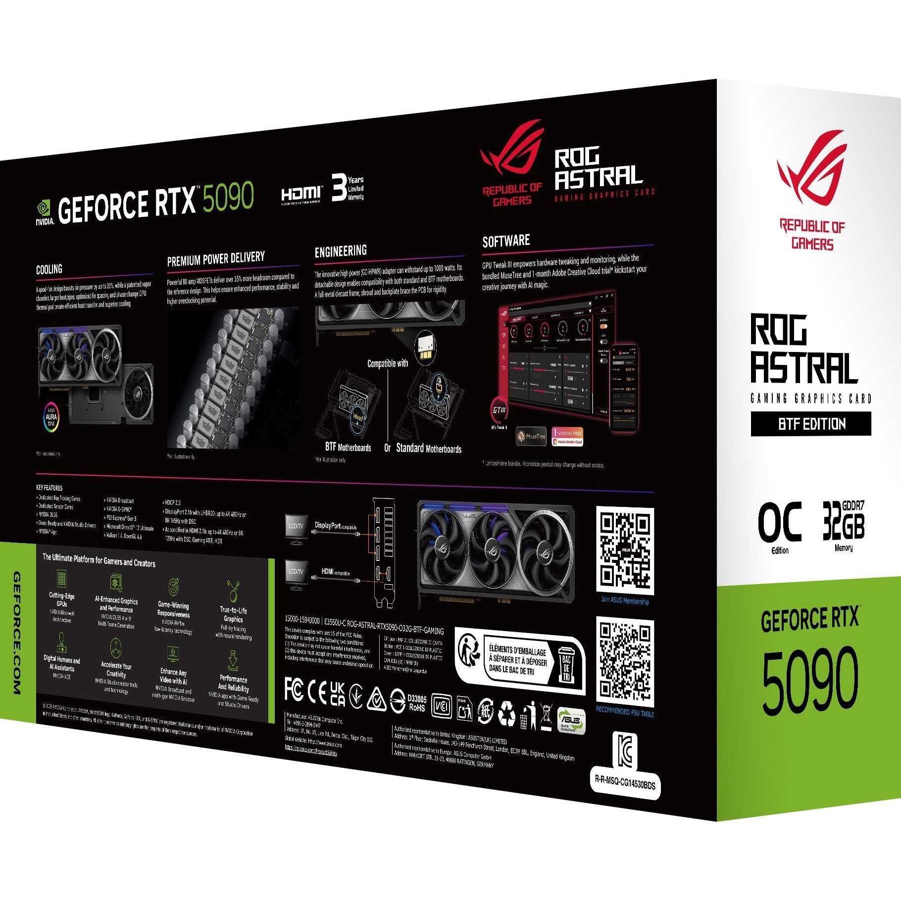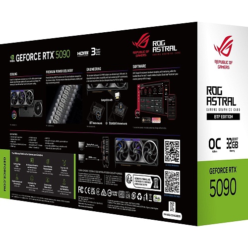 Відеокарта Asus ROG Astral GeForce RTX 5090 32GB OC BTF Edition створена для екстремальної продуктивності та максимальної адаптивності. Завдяки інноваційній технології BTF вона оснащена знімним адаптером живлення GC-HPWR, здатним витримувати до 1000 Вт, що дозволяє використовувати її як з традиційними материнськими платами, так і з сучасними BTF-платами. Система охолодження включає запатентовану випарну камеру, термопрокладку з фазовим переходом і збільшену щільність ребер радіатора. Чотири вентилятори створюють спрямований потік повітря, підтримуючи стабільні температури навіть при пікових навантаженнях. Така конструкція гарантує максимальну тактову частоту і бездоганну стабільність в найвимогливіших ігрових сценаріях.