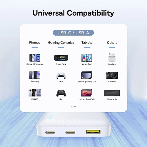 | Вихідні порти | 2 х USB-C: 5V (3A) / 9V (2.22A) / 10V (2.25A) / 12V (1.5A), 22.5W 1 х USB-A: 5V (3A) / 9V (2.A) / 10V (2.25A) / 12V (1.5A) |