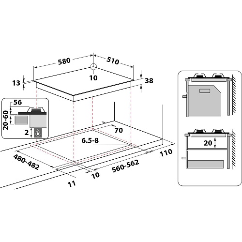 | Розміри | 580 х 510 х 51 мм (варильна поверхня) • 562-560 х 482-480 х 38 мм (монтажні розміри) |