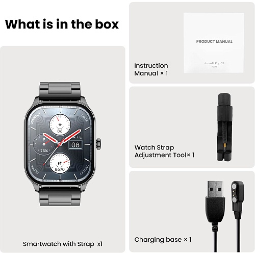 Комплектація | Смарт-годинник • магнітний зарядний пристрій • інструмент для регулювання ремінця • документація |
