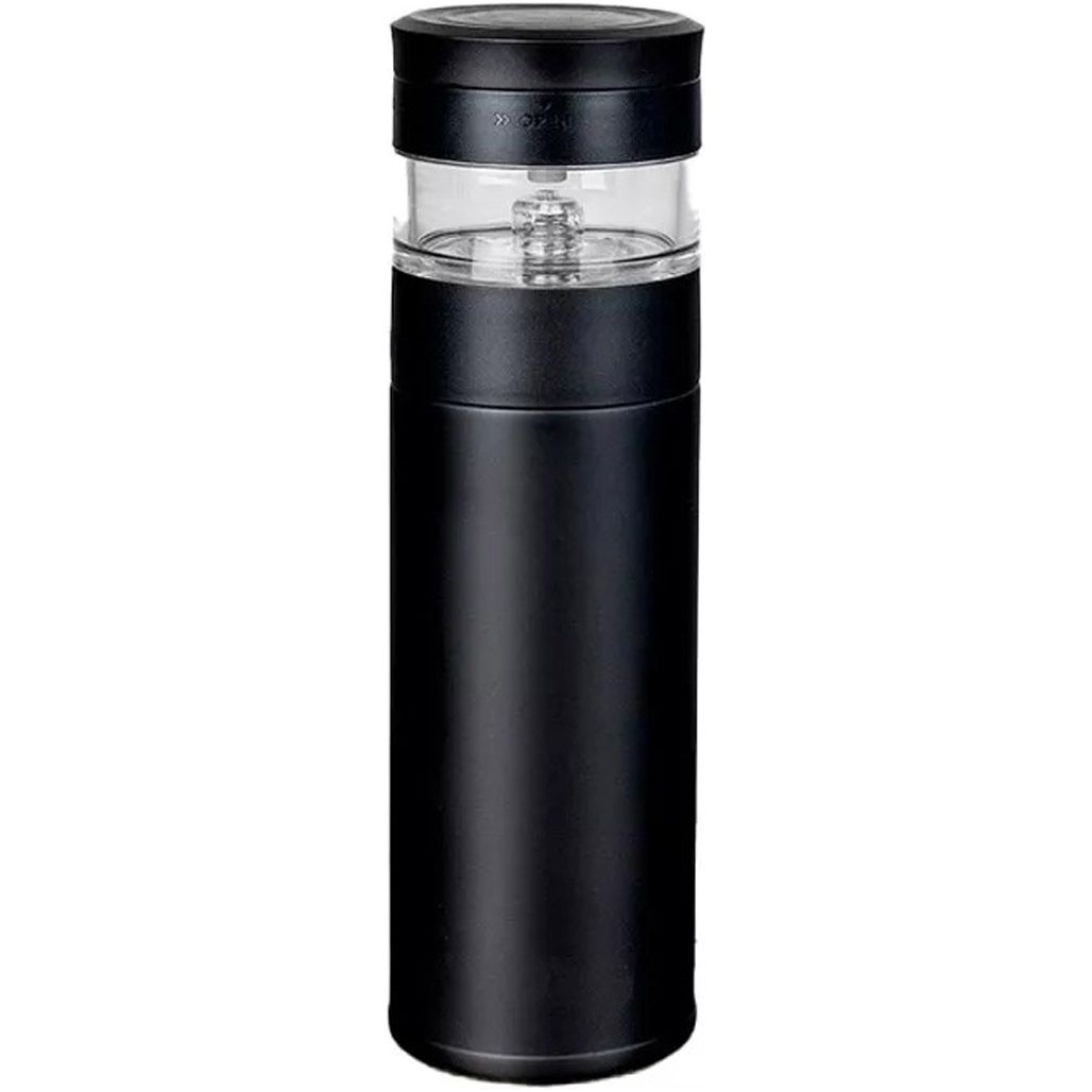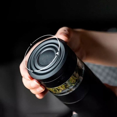 Купила чорний колір, і він виглядає стильно, не привертає уваги. Об'єм 360 мл вистачає на дві порції чаю, сепаратор для чаю дозволяє заварювати зелені листки без осаду в напої – зручно, не потрібно витягувати пакетик. Тепло тримає 4-5 годин, кава залишається гарячою, як з термоса.