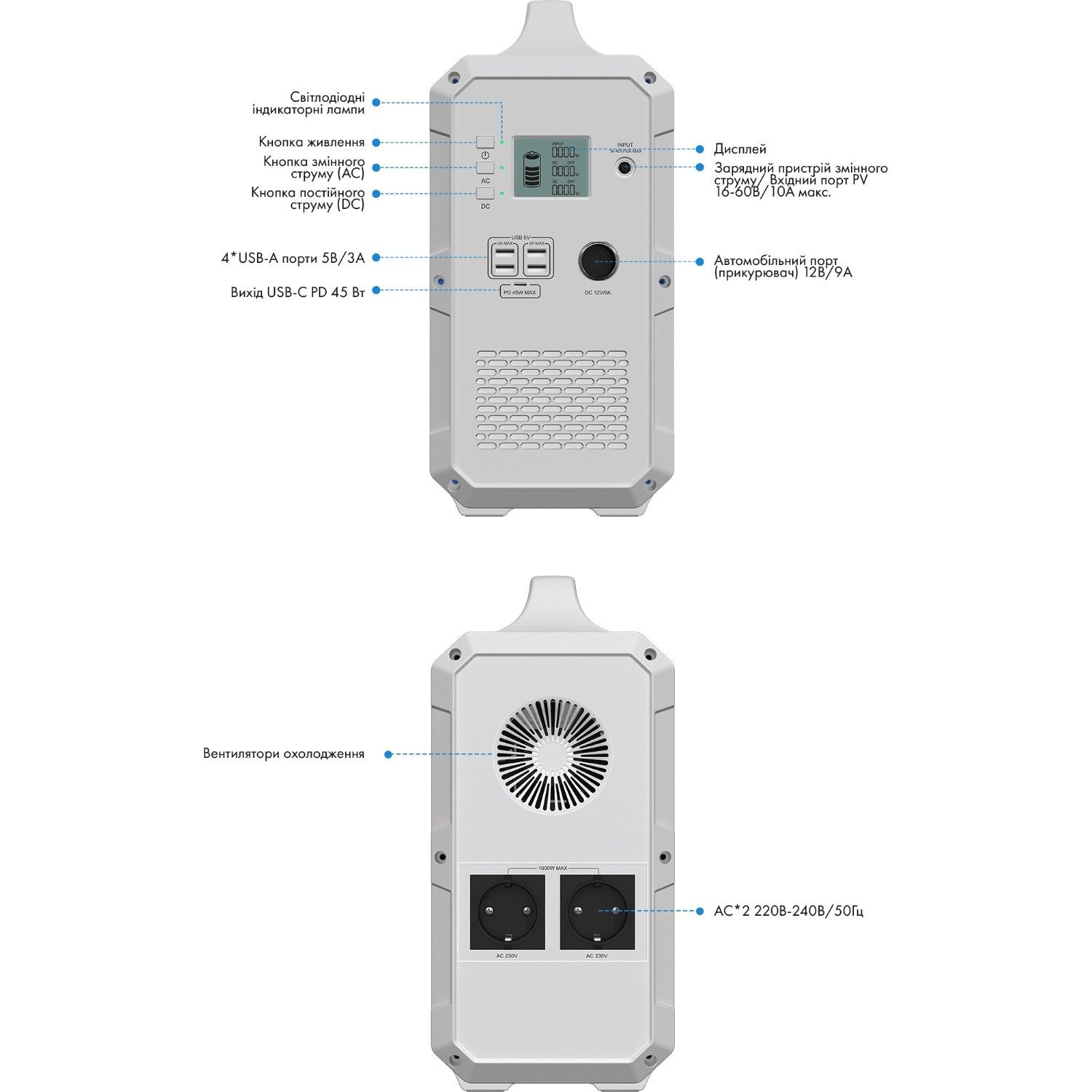 | Вихідні порти | 4 x USB-A: 5V / 3A / 15W 1 x USB-C: Power Delivery 45W 1 x Автомобільний порт: 12V / 9A |