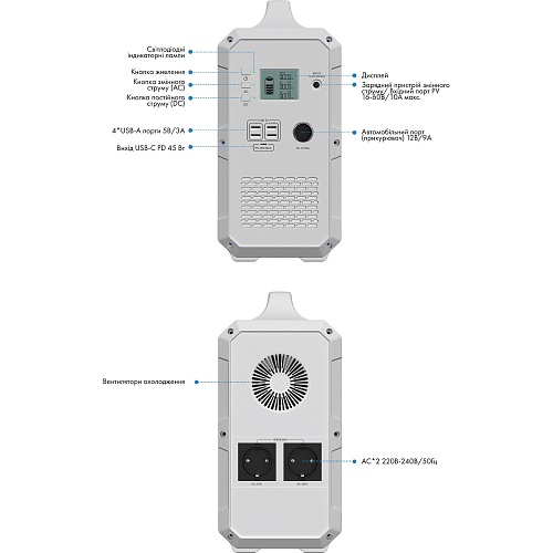 | Комплектація | Зарядна станція • зарядний пристрій змінного струму • кабель для заряджання від сонячних батарей • документація |